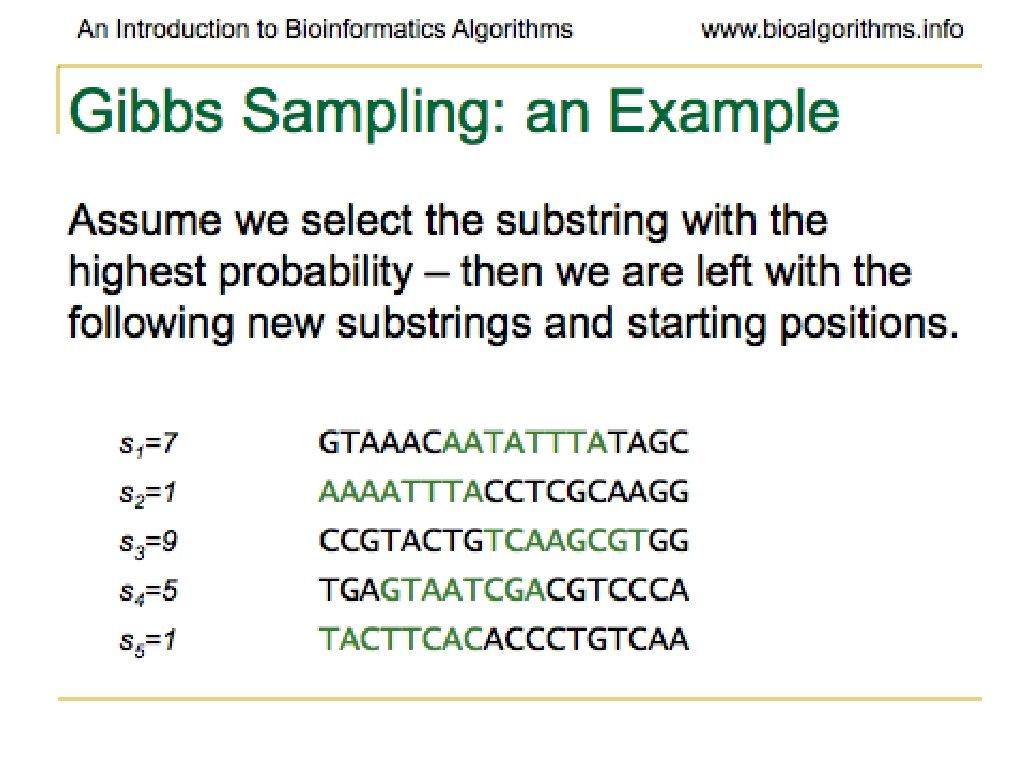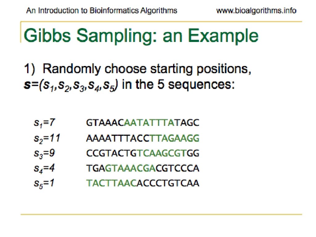 Problems with Gibbs Sampling • Often converges to a locally optimal motif rather than a global optimum • Needs to be run many times with random seeds to get a good result