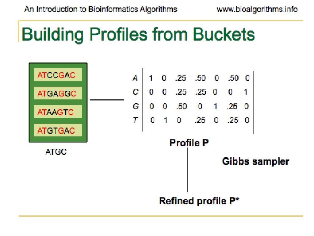 Random Projection • Get motif from sequences in the bucket • Use the information for a local refinement scheme, such as Gibbs Sampling