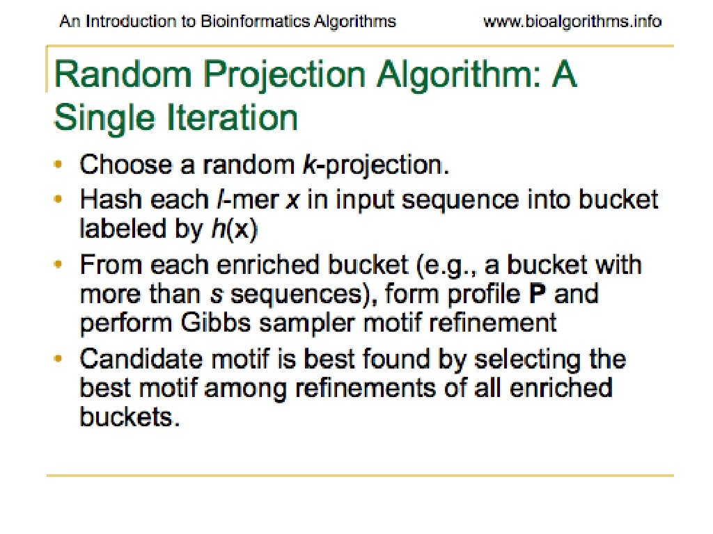 Random Projection • Select k positions in length l string • For each l-tuple in input sequences that has projection k at correct locations, hash into a bucket • Recover motif from the bucket containing many l-mers (Use Gibbs, etc. )