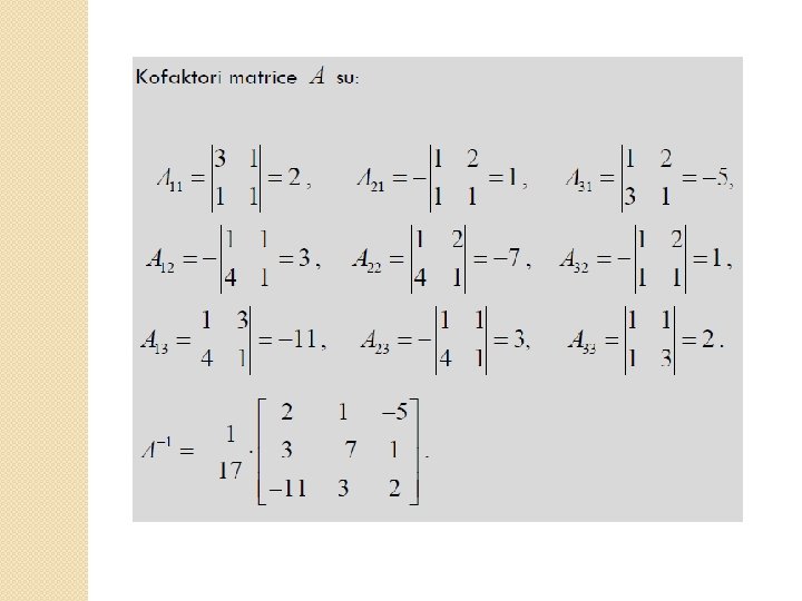 Primer 2. Pošto je det A različita od nule, matrica A je regularna, pa postoji njena inverzna matrica. Izračunajmo kofaktore matrice A: