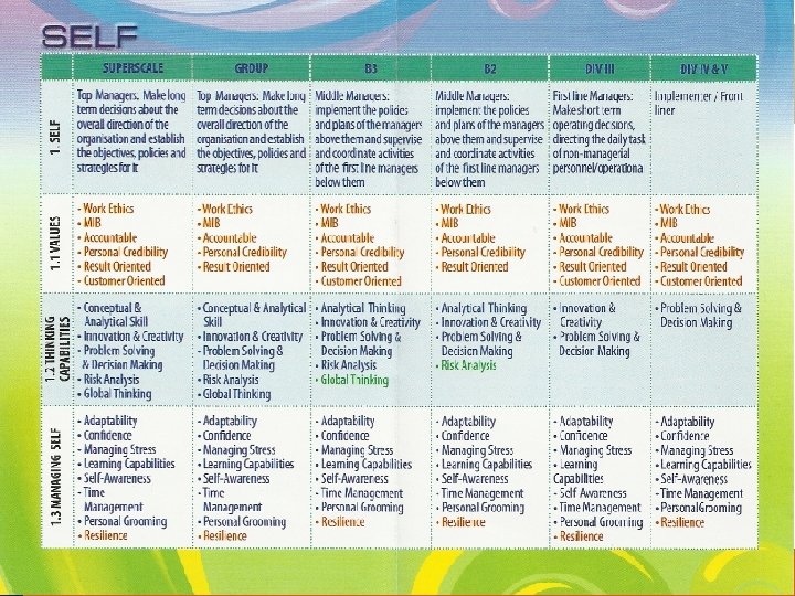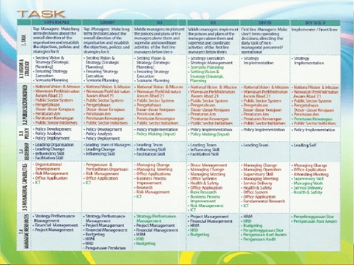RANGKA KOMPETENSI SELF Self Effectiveness PEOPLE Effective interaction, support, shared work & communication within the team and with other team TASK Setting a clear goal, objectives and organization and management of the process • Values • Thinking Capabilities • Managing Self • Managing Teams • Relationship Building and Networking • Communication • Developing Others • Vision and Strategy • Public Sector Acumen • Policy • Leadership • Management Capabilities • Managing Resources