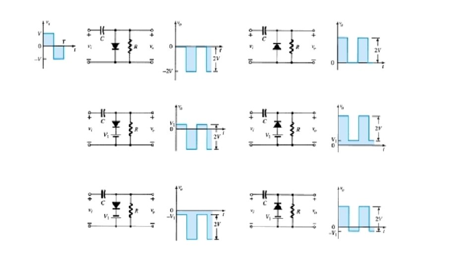 q. Sinyal keluar Vo pada rangkaian clamper ditunjukkan pada gambar dibawah ini. q Saat sinyal masuk bernilai positif, maka tegangan keluar bernilai 0. q Saat sinyal masuk bernilai negatif, maka tegangan keluar bernilai -2 V.