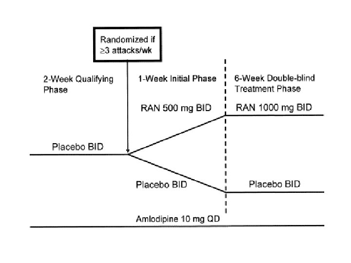 ERICA: Study design Evaluation of Ranolazine In Chronic Angina History of CAD* angina (≥ 3 angina episodes/week) 10 mg/day N = 565 Ranolazine extended-release 500 mg bid (1 week) then 1000 mg bid n = 281 Stable Amlodipine Randomized Double-blind Placebo n = 284 7 weeks Primary efficacy variable: Angina frequency (weekly average) *≥ 60% stenosis, previous MI, and/or stressinduced perfusion defect Stone PH et al. J Am Coll Cardiol. 2006; 48: 566 -75.