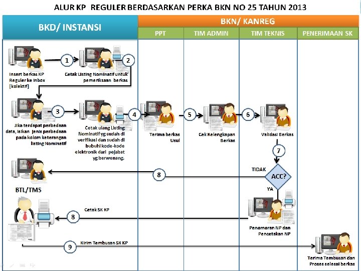 Tatacara Pemberian Persetujuan Teknis KP Reguler IV/b Kebawah Daftar Nominatif (Listing Data Elektronik) PNS • PPK masing-masing instansi atau pejabat yang ditunjuk setelah menerima daftar nominatif (listing data elektronik) wajib melakukan pemeriksaan terhadap isi daftar nominatif (listing data elektronik) tersebut. • Apabila terdapat perbedaan data kepegawaian, maka PPK masing-masing instansi wajib memperbaiki data yang tercantum dalam daftar nominatif (listing data elektronik) dengan data kepegawaian yang benar dan disampaikan data pendukungnya kepada Kepala BKN/Kepala Kanreg BKN.