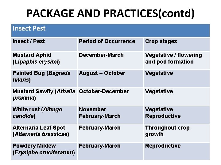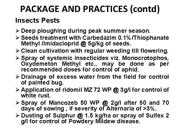 PACKAGE AND PRACTICES (contd) Insects Pests Ø Deep ploughing during peak summer season. Ø Seeds treatment with Carbedazim 0. 1%/Thiophanate Methyl /Imidacloprid @ 5 g/kg of seeds. Ø Clean cultivation with regular weeding till flowering. Ø Spray of systemic insecticides viz. Monocrotophos, Oxydemeton Methyl etc. , may be done as per recommended doses for control of aphid. Ø Drainage of excess water from the field for control of painted bug. Ø Application of ridomil MZ 72 WP @ 3 g/l for control of white rust. Ø Spray of Mancozeb 50 WP @ 2 g/l after 50 and 70 days of sowing , if severity of Alternaria of >3%. Ø Dusting of Sulphur @ 1. 5 kg/ha or spray of Sulfex 2 g/l for control of Powdery Mildew disease.