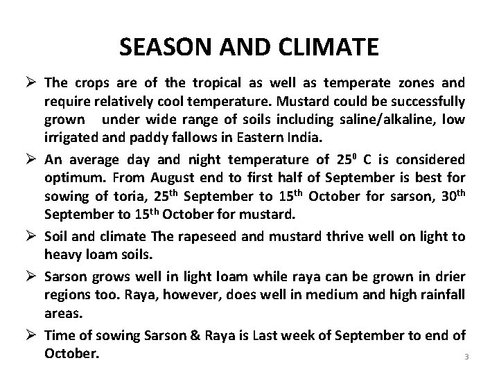 SEASON AND CLIMATE Ø The crops are of the tropical as well as temperate zones and require relatively cool temperature. Mustard could be successfully grown under wide range of soils including saline/alkaline, low irrigated and paddy fallows in Eastern India. Ø An average day and night temperature of 250 C is considered optimum. From August end to first half of September is best for sowing of toria, 25 th September to 15 th October for sarson, 30 th September to 15 th October for mustard. Ø Soil and climate The rapeseed and mustard thrive well on light to heavy loam soils. Ø Sarson grows well in light loam while raya can be grown in drier regions too. Raya, however, does well in medium and high rainfall areas. Ø Time of sowing Sarson & Raya is Last week of September to end of October. 3