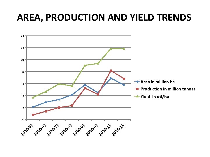 AREA, PRODUCTION AND YIELD TRENDS 14 12 10 8 Area in million ha 6 Production in million tonnes Yield in qtl/ha 4 2 15 -1 6 1 20 20 10 -1 1 00 -0 1 20 90 -9 1 19 80 -8 1 19 70 -7 1 19 60 -6 19 19 50 -5 1 0
