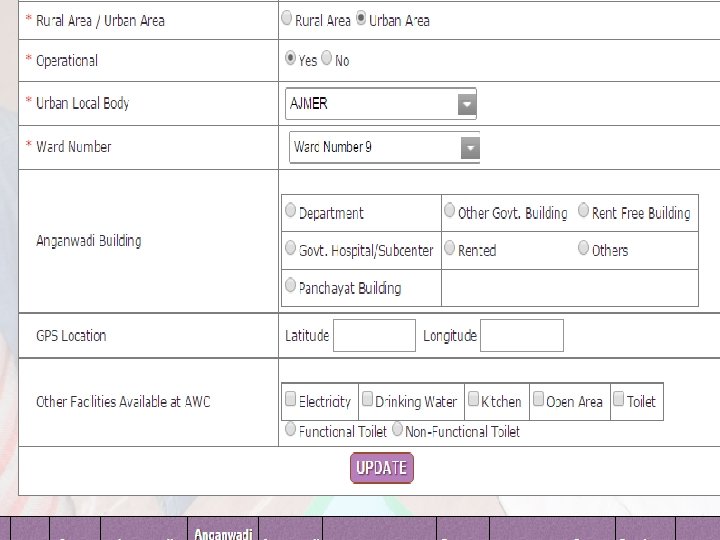Step 7 • Click the Type of AWC - Main or Mini; Rural, Urban, or Tribal; Pukka, or Kuccha; Own building, Rented, Community, or Open Space