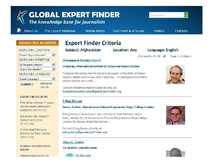 Global. Expert. Finder. org What does Global Expert Finder do? Ø Connects journalists directly to experts around the world Ø Provides journalists with analysis by experts (articles, videos, podcasts, blog posts, etc. ) Ø Sends journalists media alerts with experts to contact when news stories break
