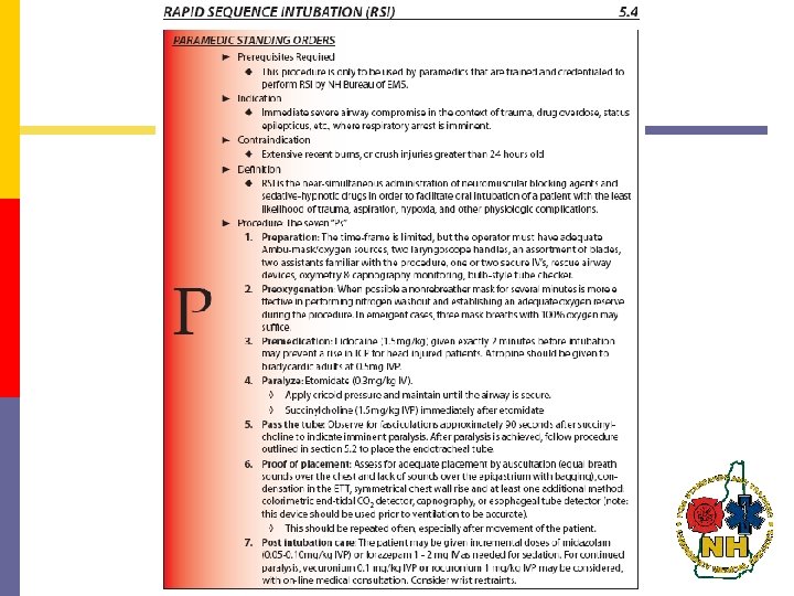 RSI Assistant Why RSI Assistants? p Required as part of 2009 NHEMS Patient Care Protocol 5. 4 RSI p RSI Assistant retraining required every two years 2009 NHEMS Rapid Sequence Intubation (RSI) Protocol 5. 4 This procedure is only to be used by paramedics that are trained and credentialed to perform RSI by NH Bureau of EMS. Either 2 RSI paramedics or 1 RSI paramedic and 1 RSI assistant must be present. p