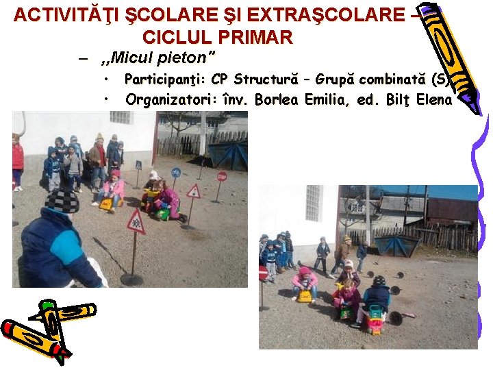 ACTIVITĂŢI ŞCOLARE ŞI EXTRAŞCOLARE – CICLUL PRIMAR – , , Micul pieton” • • Participanţi: CP Structură – Grupă combinată (S) Organizatori: înv. Borlea Emilia, ed. Bilţ Elena