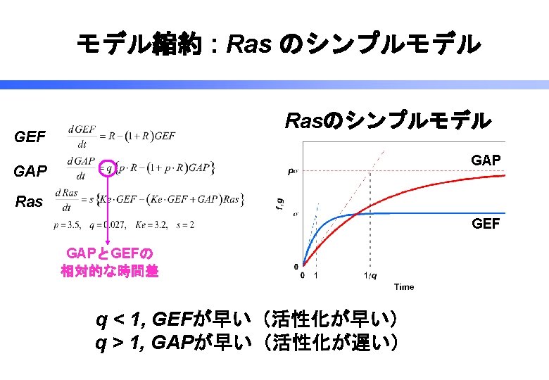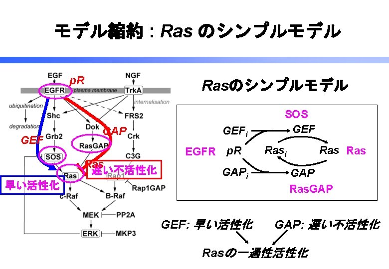 Rap 1とRasのシンプルモデル 違いはたった一つ SOS Ras:さっきと同じ GEFi Trk. A p. R GAPi Rap 1 GEFi Trk. A p. R Rasi Ras GAP Ras. GAP 刺激依存 C 3 G GEF Rap 1 i Rap 1 GAP (constant) Rap 1 GAP 刺激非依存