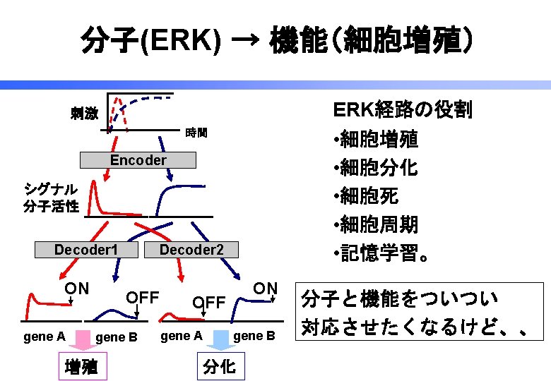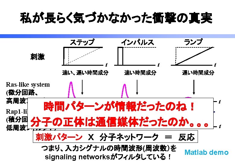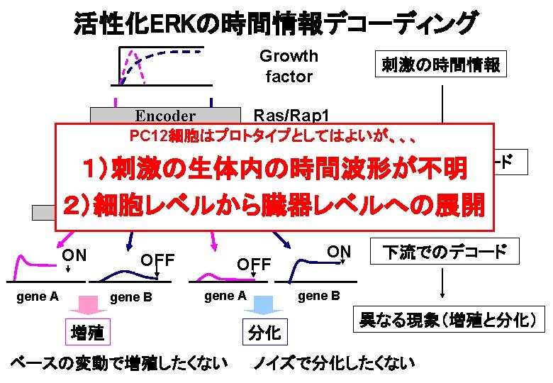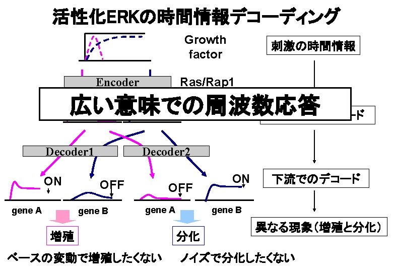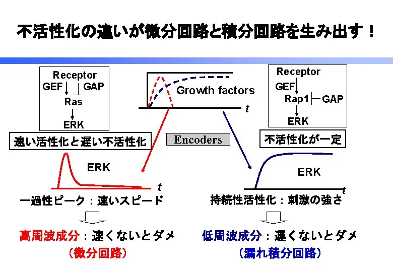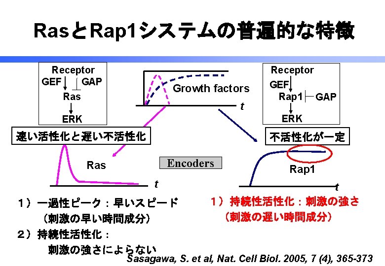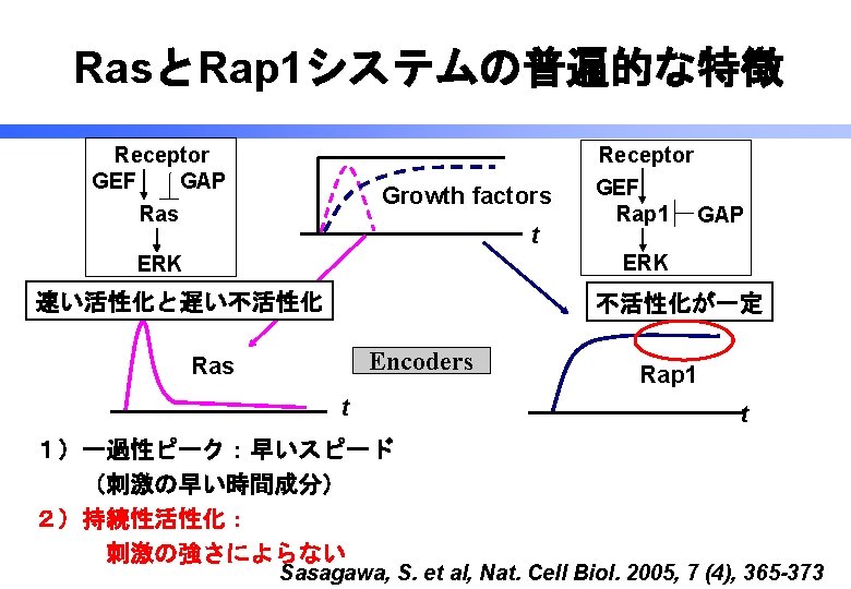 RasとRap 1システムの普遍的な特徴 Receptor GEF GAP Ras Growth factors t Receptor GEF Rap 1 GAP ERK 速い活性化と遅い不活性化が一定 Encoders Ras t Rap 1 t 1)一過性ピーク:早いスピード (刺激の早い時間成分) Sasagawa, S. et al, Nat. Cell Biol. 2005, 7 (4), 365 -373