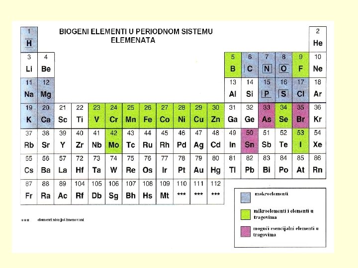 PODELA ELEMENATA • elementi neophodni za izgradnju i normalan razvoj (I grupa), C, O, H, N, P, S, Ca, K, Cl, Na, Mg, Zn, Fe, Cu, Mn, Mo, Co, Se i dr. Sastojci su enzima, hormona vitamina i smatraju se nezamenljivim • elementi čija biološka funkcija nije dovoljno proučena (II grupa) Sr, Br, F, B, Si, Cr, Be, Ni, Li, Cs, Sn, Al, Ba, Rb, Ti, Ag, Ga, Ge, As, Sb, U, Th, V i dr. Ulaze u sastav jedinjenja čija funkcija u metabolizmu nije dovoljno proučena • elementi čije se prisustvo smatra slučajnim (III grupa elemenata) Tl, Nb, In, Te, La, Pr, Nd, Eu, Tb, Er, W, Hg, Pb, Cd, Re i dr. Nalaze se u biljkama, ali nema podataka o njihovoj funkcijiu metabolizmu