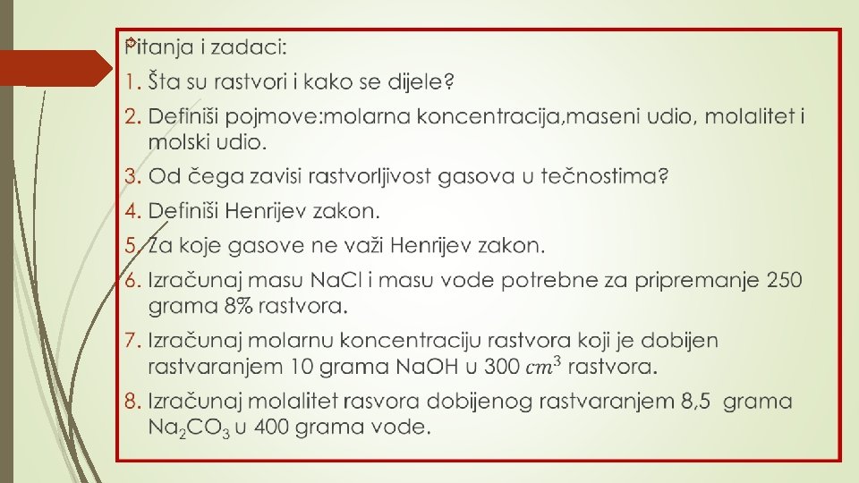 Rastvorljivost gasova u tečnostima ! Rastvorljivost gasova u tečnostima zavisi od : v Prirode supstance v Temperature i v Pritiska gasa Pri porastu temperature rastvorljivost se smanjuje , a pri porastu pritiska povećava.