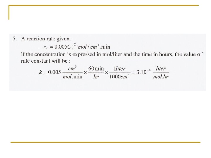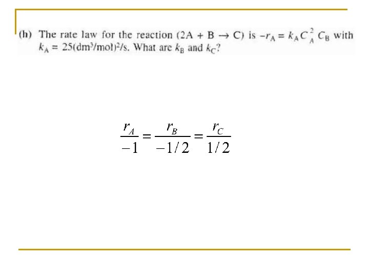 4. For the complex reaction with stoichiometry A + 3 B 2 R + S and with second-order rate expression: -r. A = k 1 CACB are the reaction rates related as follows: r. A = r. B = r. R? If the rates are not so related, then how are they related? Account for the sign, + or -. 5. A certain reaction has a rate given by: - r. A =0. 005 C 2 A mol/cm 3. min If the concentration is to be expressed in mol/l and time in hours, what would be the value and units of the rate constant?