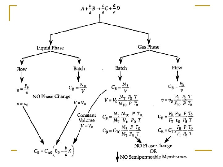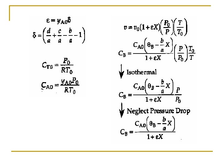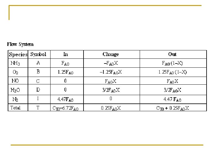 Flow System Stoichiometric Table Species Symbols Initial Change Remaining A A FA 0 -FA 0 X FA=FA 0(1–X) B B FB 0=FA 0ΘB -(b/a)FA 0 X FB=FA 0(ΘB –(b/a)X) C C FC 0=FA 0ΘC (c/a)FA 0 X FC=FA 0(ΘC+(c/a)X) D D FD 0=FA 0ΘD (d/a)FA 0 X FD=FA 0(ΘD+(d/a)X) Inert I FI=FA 0ΘI FI = FA 0ΘI FT 0 FT=FT 0+δFA 0 X