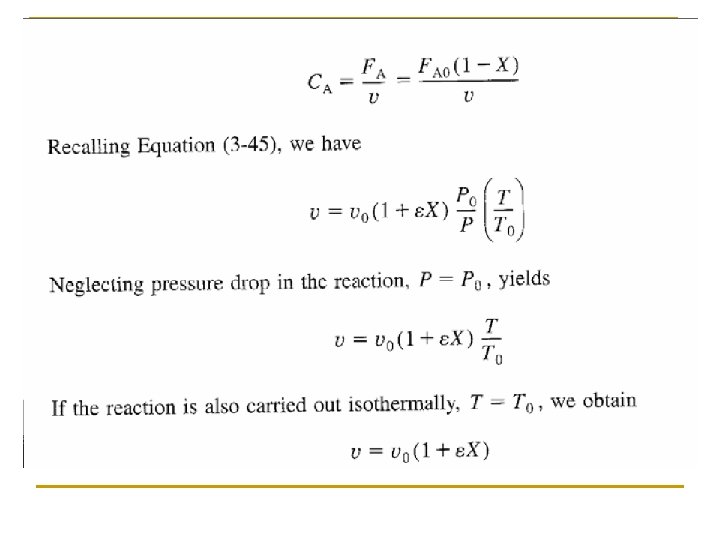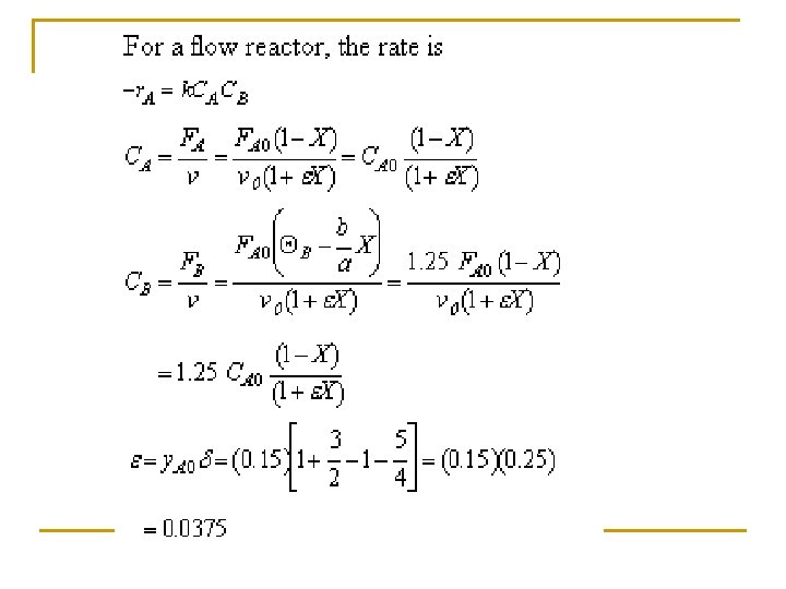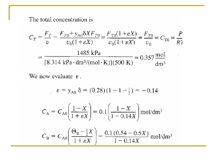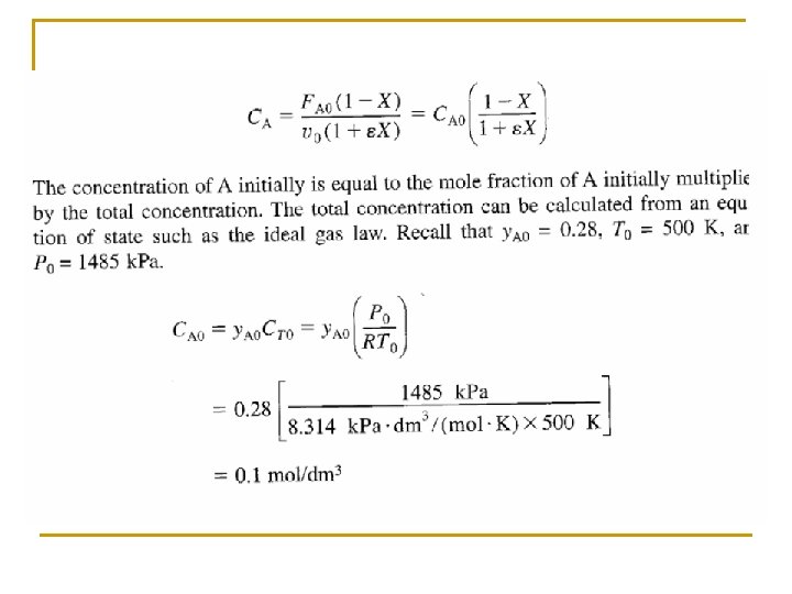 Concentration: Gas Flow System For gaseous reactants and assuming ideal gases, therefore from ideal gas law we may get From Stoichiometric Table Where: Substitute in v