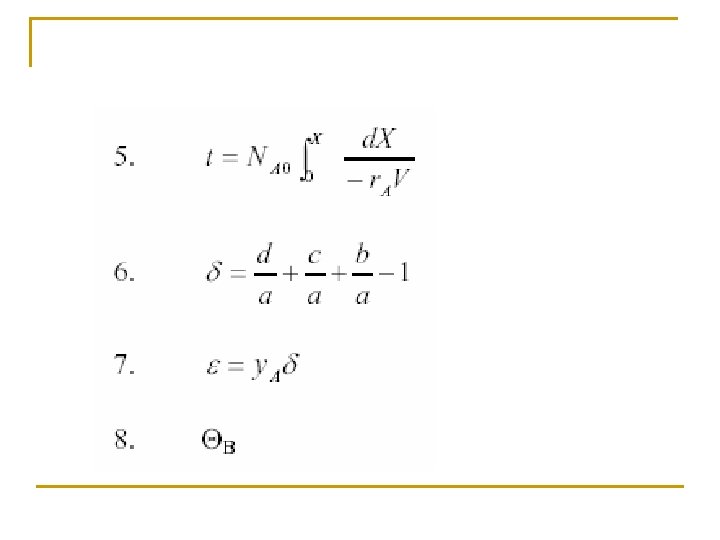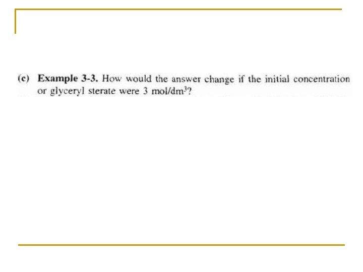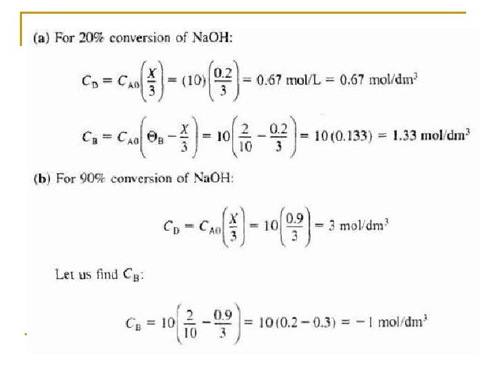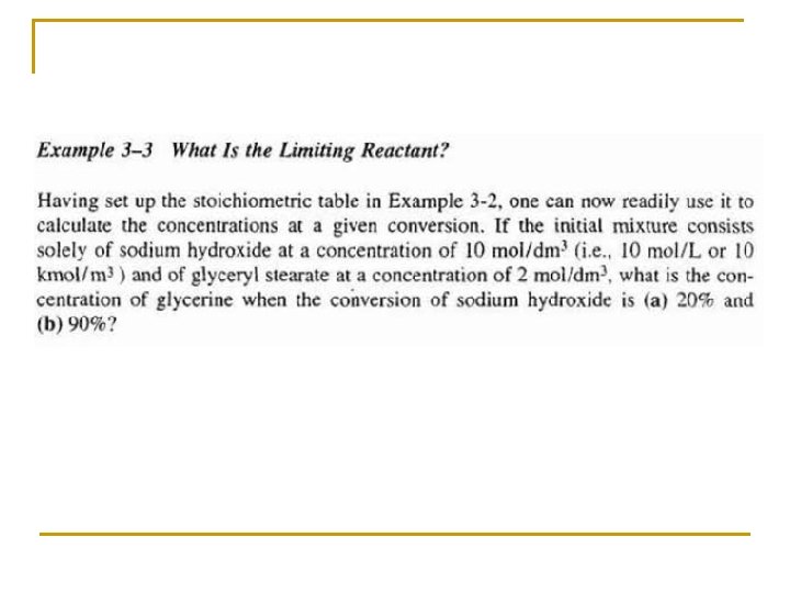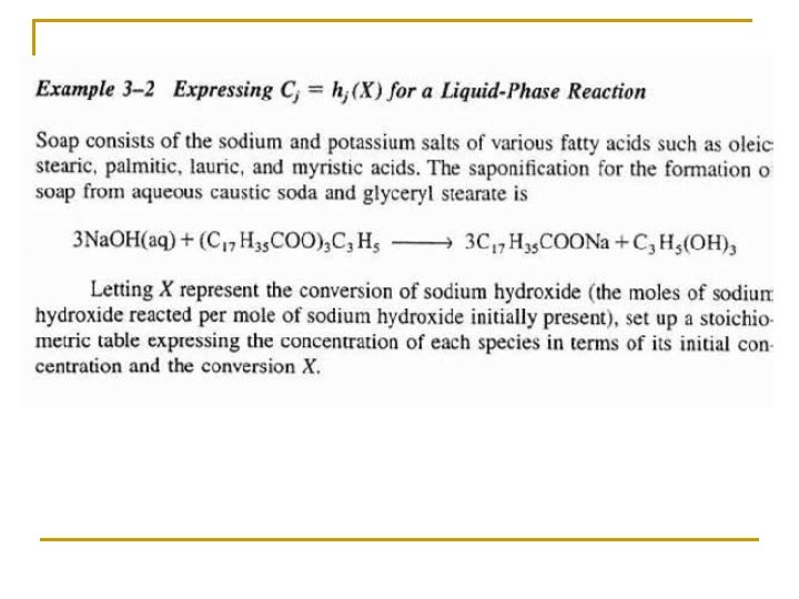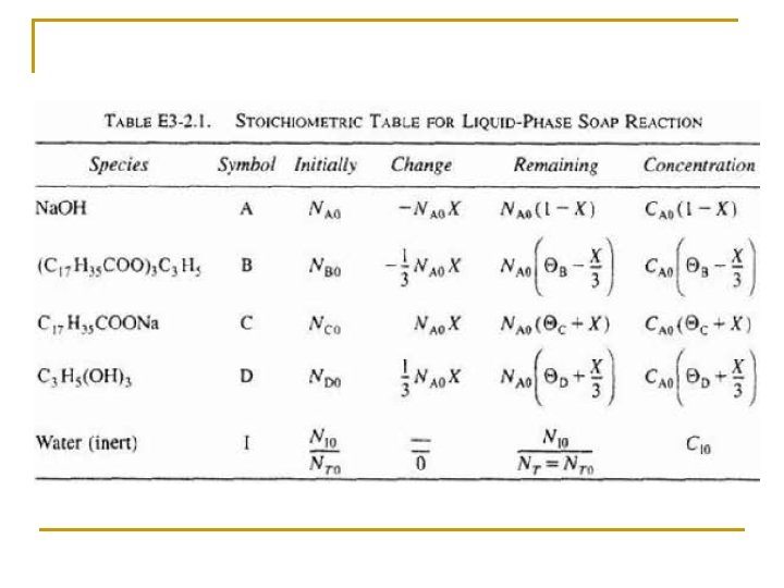 Species Symbols Initial Change Remaining Na. OH A NA 0 -NA 0 X NA=NA 0(1–X) C 17 H 35 COO)3 C 3 H 5 B NB 0=NA 0ΘB -(1/3)NA 0 X NB=NA 0(ΘB –(1/3)X) C 17 H 35 COONa C NC 0=NA 0ΘC NA 0 X NC=NA 0(ΘC+X) C 3 H 5(OH)3 D ND 0=NA 0ΘD (1/3)NA 0 X ND=NA 0(ΘD+(1/3)X) Water (Inert) I NI=NA 0ΘI NI = NA 0ΘI NT 0 NT=NT 0+δNA 0 X