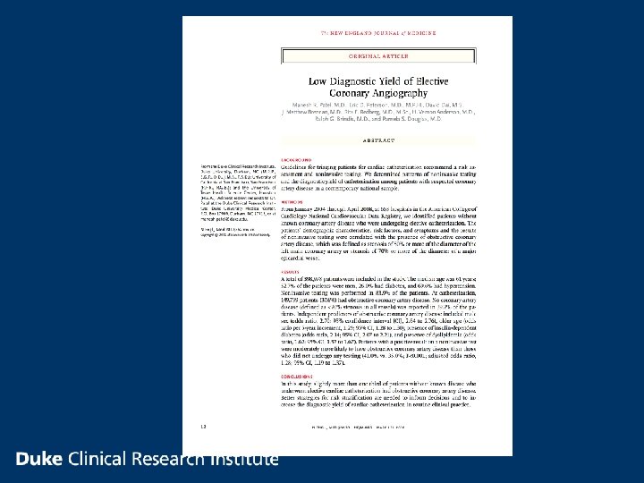 Rate of Obstructive Coronary Disease in Elective Diagnostic Cath Manesh R. Patel, MD Assistant Professor of Medicine Director Cath Lab Research – Duke University Medical Center