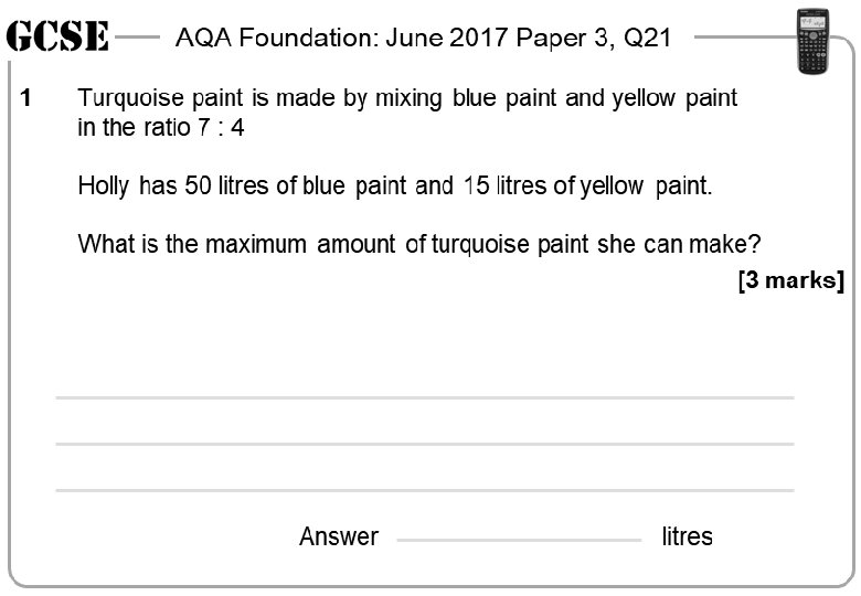 AQA Foundation: June 2017 Paper 3, Q 21 1 Turquoise paint is made by mixing blue paint and yellow paint in the ratio 7 : 4 AQA Foundation: June 2017 Paper 3, Q 21 1 Holly has 50 litres of blue paint and 15 litres of yellow paint. What is the maximum amount of turquoise paint she can make? [3 marks] Answer litres Answer AQA Foundation: June 2017 Paper 3, Q 21 1 Turquoise paint is made by mixing blue paint and yellow paint in the ratio 7 : 4 litres AQA Foundation: June 2017 Paper 3, Q 21 1 Turquoise paint is made by mixing blue paint and yellow paint in the ratio 7 : 4 Holly has 50 litres of blue paint and 15 litres of yellow paint. What is the maximum amount of turquoise paint she can make? [3 marks] Answer litres