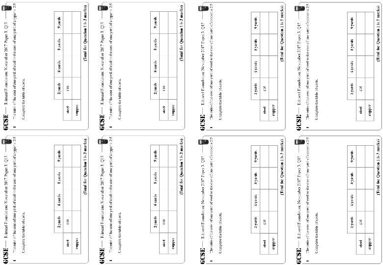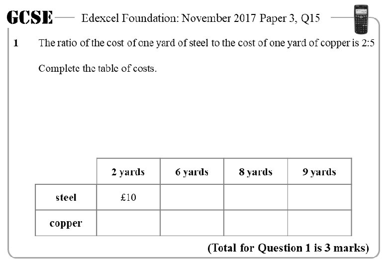 GCSE 1 Edexcel Foundation: November 2017 Paper 3, Q 15 The ratio of the cost of one yard of steel to the cost of one yard of copper is 2: 5 Complete the table of costs. Steel: 2 yards = £ 10 1 yard = £ 5 Complete top row 2 yards 6 yards 8 yards 9 yards steel £ 10 copper £ 25 £ 30 £ 75 £ 40 £ 45 £ 100 £ 112. 50 (Total for Question 1 is 3 marks)
