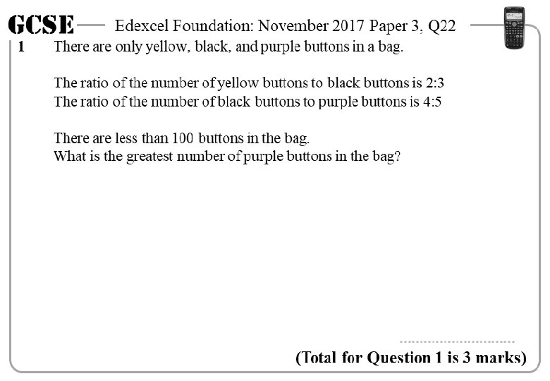 GCSE 1 Edexcel Foundation: November 2017 Paper 3, Q 22 There are only yellow, black, and purple buttons in a bag. GCSE 1 The ratio of the number of yellow buttons to black buttons is 2: 3 The ratio of the number of black buttons to purple buttons is 4: 5 There are less than 100 buttons in the bag. What is the greatest number of purple buttons in the bag? (Total for Question 1 is 3 marks) GCSE 1 Edexcel Foundation: November 2017 Paper 3, Q 22 There are only yellow, black, and purple buttons in a bag. The ratio of the number of yellow buttons to black buttons is 2: 3 The ratio of the number of black buttons to purple buttons is 4: 5 There are less than 100 buttons in the bag. What is the greatest number of purple buttons in the bag? (Total for Question 1 is 3 marks)
