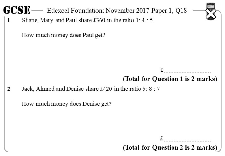GCSE 1 Edexcel Foundation: November 2017 Paper 1, Q 18 GCSE 1 Shane, Mary and Paul share £ 360 in the ratio 1: 4 : 5 How much money does Paul get? Edexcel Foundation: November 2017 Paper 1, Q 18 Shane, Mary and Paul share £ 360 in the ratio 1: 4 : 5 How much money does Paul get? £ £ (Total for Question 1 is 2 marks) 2 Jack, Ahmed and Denise share £ 420 in the ratio 5: 8 : 7 (Total for Question 1 is 2 marks) 2 How much money does Denise get? Jack, Ahmed and Denise share £ 420 in the ratio 5: 8 : 7 How much money does Denise get? £ £ (Total for Question 2 is 2 marks) GCSE 1 Edexcel Foundation: November 2017 Paper 1, Q 18 (Total for Question 2 is 2 marks) GCSE 1 Shane, Mary and Paul share £ 360 in the ratio 1: 4 : 5 How much money does Paul get? Edexcel Foundation: November 2017 Paper 1, Q 18 Shane, Mary and Paul share £ 360 in the ratio 1: 4 : 5 How much money does Paul get? £ £ (Total for Question 1 is 2 marks) 2 Jack, Ahmed and Denise share £ 420 in the ratio 5: 8 : 7 How much money does Denise get? £ (Total for Question 2 is 2 marks)