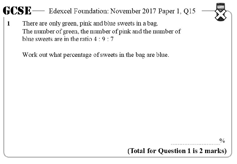 GCSE 1 Edexcel Foundation: November 2017 Paper 1, Q 15 There are only green, pink and blue sweets in a bag. The number of green, the number of pink and the number of blue sweets are in the ratio 4 : 9 : 7 Work out what percentage of sweets in the bag are blue. 4 : 9 : 7 = 20 parts 35 % (Total for Question 1 is 2 marks)