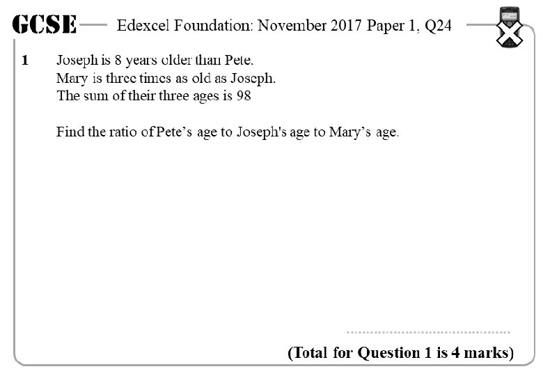 GCSE 1 Edexcel Foundation: November 2017 Paper 1, Q 24 Joseph is 8 years older than Pete. Mary is three times as old as Joseph. The sum of their three ages is 98 Find the ratio of Pete’s age to Joseph's age to Mary’s age. Pete : Jo : Mary x : x + 8 : 3 x = Total = 98 x + 8 + 3 x = 98 5 x + 8 = 98 5 x = 90 x = 18 Pete : Jo : Mary 18 : 18 + 8 : (3 x 18) 18 : 26 : 54 9 : 13 : 27 (Total for Question 1 is 4 marks)