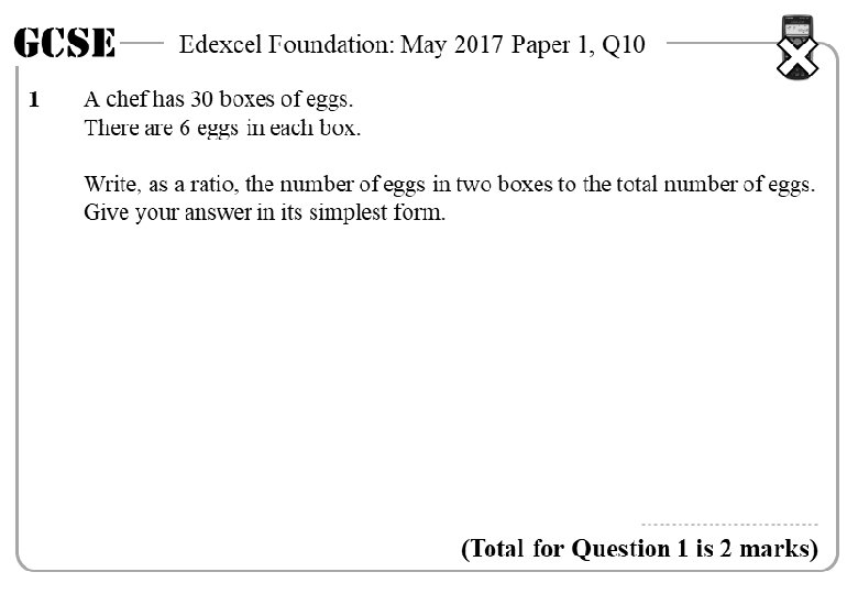 GCSE 1 Edexcel Foundation: May 2017 Paper 1, Q 10 A chef has 30 boxes of eggs. There are 6 eggs in each box. Write, as a ratio, the number of eggs in two boxes to the total number of eggs. Give your answer in its simplest form. 2 boxes : total 2 boxes = 2 x 6 = 12 total = 30 x 6 = 180 12 : 180 6 : 90 3 : 45 1: 15 1 : 15 (Total for Question 1 is 2 marks)