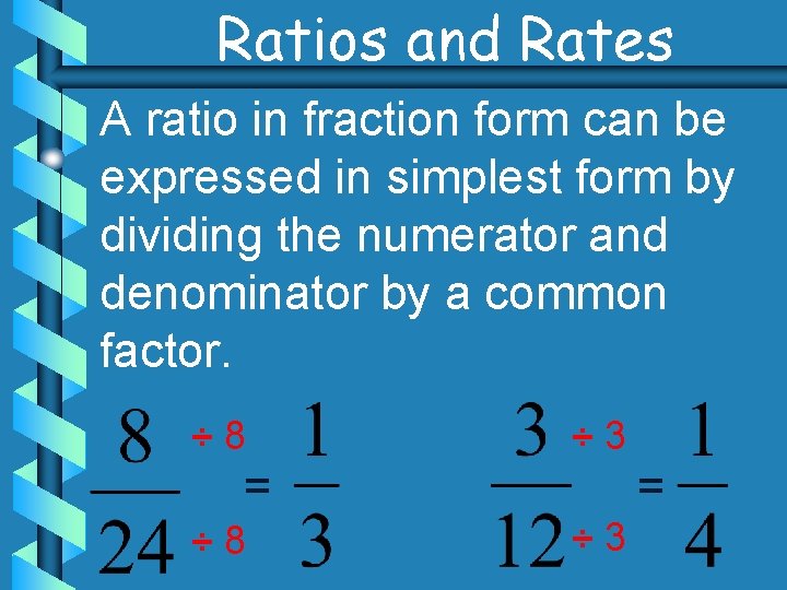 Ratios and Rates A ratio in fraction form can be expressed in simplest form by dividing the numerator and denominator by a common factor. ÷ 8 ÷ 3 = ÷ 8 = ÷ 3
