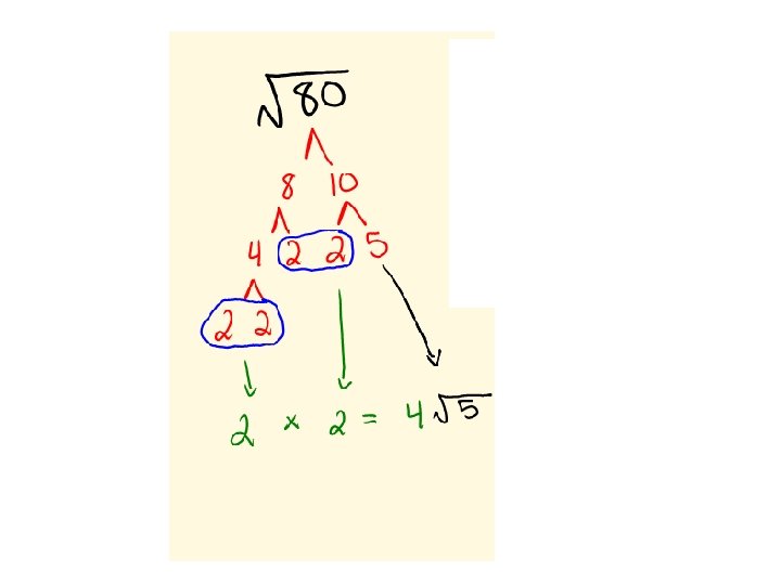 How to Simplify Radicals 1. Make a factor tree of the radicand. 2. Circle all final factor “nth groups”. 3. All circled “nth group” move outside the radical and become single value. 4. Multiply all values outside radical. 5. Multiple all final factors that were not circle. Place product under radical sign.