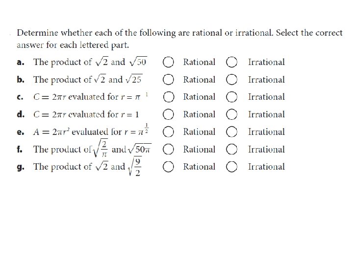 Will it be Rational or Irrational? Sums: Rational + Rational = Rational + Irrational = Irrational + Irrational = Products: Rational x Rational = Rational x Irrational = Irrational x Irrational =