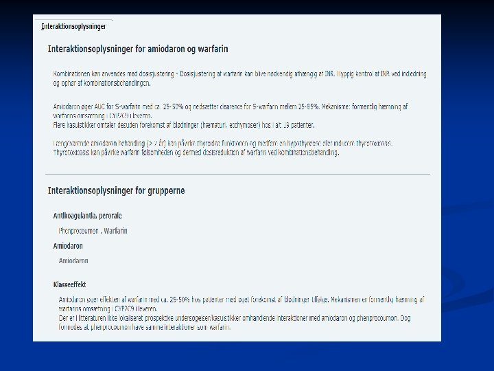 DEL-KONKLUSION n Farmako-dynamiske n ”Fysiologi” n Farmako-kinetiske n CYP systemet n n Sæde for mange interaktioner Kan nogle gange forudses Kan ofte ”forklares” Specielle forhold EM/PM og genetik