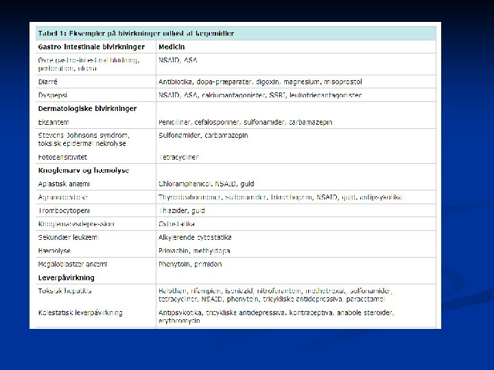 Bivirkninger Hyppighed n 5 -8 % af indlæggelser på medicinske afd. n 2 % af henvendelser til praksis n Eksempel: Acetylsalisylsyre 27 indlæggelser pr 1 mio. DDD (1 alvorlig mavesårsblødning pr. 110 kg ASA)