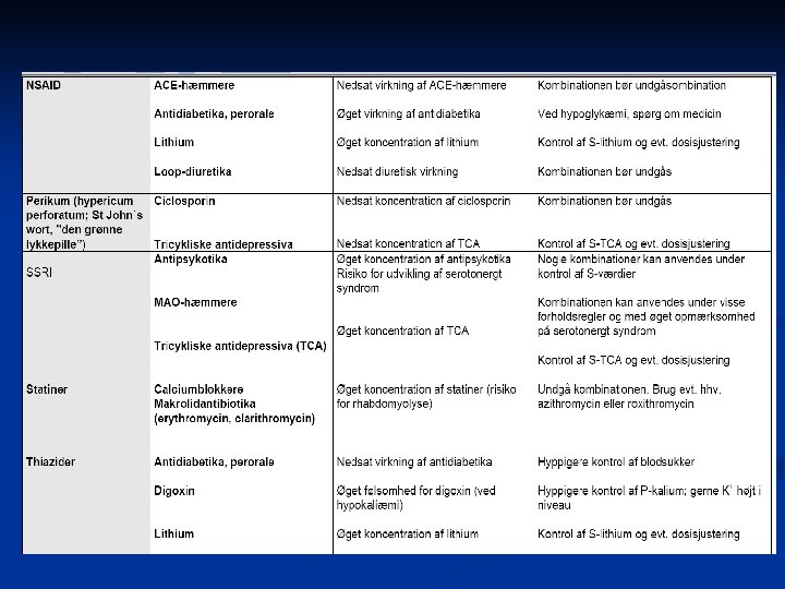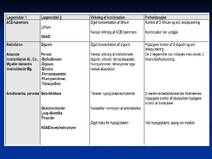 FARMAKODYNAMISKE INTERAKTIONER NSAID Beta-blokker ACE, Diuretika Verapamil Diltiazem Tricykliske Antidepressiva Adrenalin Noradrenalin Psykofarmaka