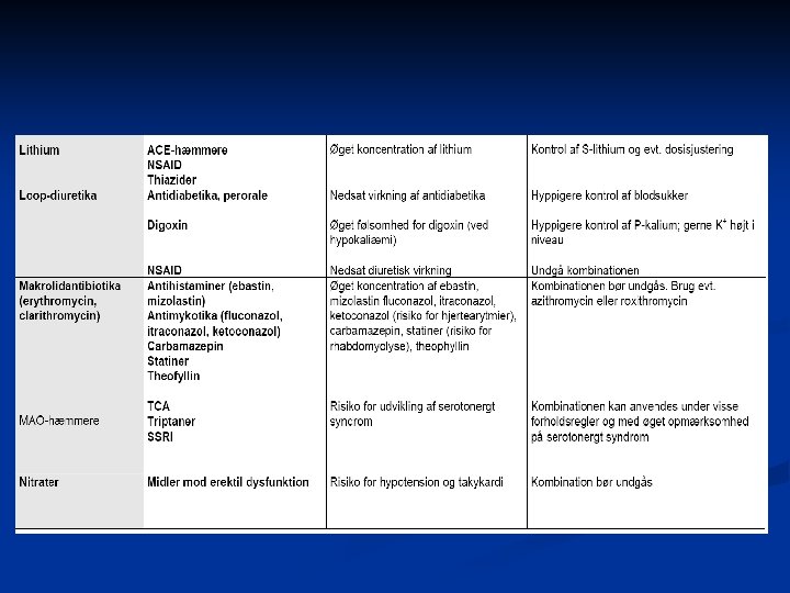 Interaktioner i praksis Risiko-lægemidler: Alvorlige bivirkninger Lille terapeutisk interval Risiko-behandling: Polyfarmaci Langtidsbehandling Risiko-patienter: Børn og ældre Nedsat nyre- og leverfunktion Genetiske varianter