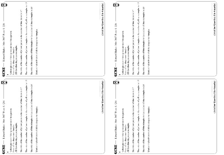 GCSE Edexcel Higher: May 2017 Paper 1, Q 14 1 Yellow pieces and blue pieces are used in a pattern. Some of the shapes are triangles. All the other shapes are rectangles. The ratio of the number of yellow pieces to the number of blue pieces is 3: 7 The ratio of the number of yellow triangles to the number of yellow rectangles is 4: 5 The ratio of the number of blue triangles to the number of blue rectangles is 2: 5 Work out what fraction of all the shapes are triangles. (Total for Question 1 is 4 marks)