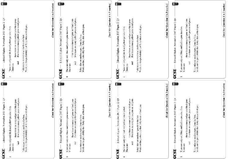GCSE 1 Edexcel Higher: November 2017 Paper 2, Q 4 There are only red, black and yellow pens in a box. There are three times as many red pens as black pens and five times as many yellow pens as red pens. GCSE 1 There are only red, black and yellow pens in a box. There are three times as many red pens as black pens and five times as many yellow pens as red pens. Toby takes at random a pen from the box. Work out the probability that Toby takes a black pen. (Total for Question 1 is 3 marks) GCSE 1 Edexcel Higher: November 2017 Paper 2, Q 4 There are only red, black and yellow pens in a box. There are three times as many red pens as black pens and five times as many yellow pens as red pens. Toby takes at random a pen from the box. Work out the probability that Toby takes a black pen. (Total for Question 1 is 3 marks) Edexcel Higher: November 2017 Paper 2, Q 4 GCSE 1 Edexcel Higher: November 2017 Paper 2, Q 4 There are only red, black and yellow pens in a box. There are three times as many red pens as black pens and five times as many yellow pens as red pens. Toby takes at random a pen from the box. Work out the probability that Toby takes a black pen. (Total for Question 1 is 3 marks)