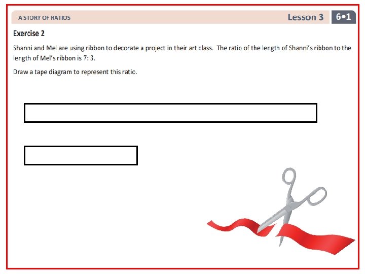 Shanni Mel What does each unit on the tape diagram represent? The Length of the Ribbon What if each unit on the tape diagram represents 1 inch? What are the lengths of the ribbon? Shanni=7 in Mel= 3 in What if each unit represents 3 inches? What are the lengths of the ribbon? Why? Shanni=21 in Mel= 9 in If each of the units represents 3 inches, what is the ratio of the length of Shanni’s ribbon to the length of Mel’s ribbon? 7: 3