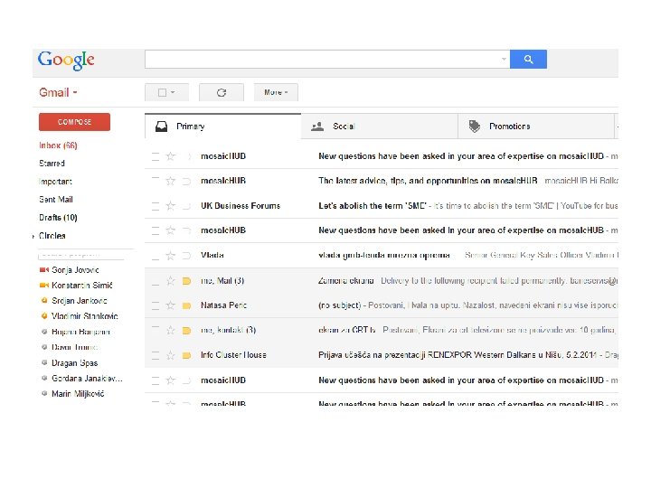 Domaći zadatak • A) Kreirati mail adresu: vaši inicijali informatika. 19@gmail. com • (Primer: jpinformatika. 19@gmail. com) • • • B) Kreirati mail na sledeći način: Subject: Vaše ime i prezime Tekst poruke: Domaći zadatak Potpis Prilog (attachment): Dokument u Word-u u kome se nalazi definicija elektronske pošte • C) Mail poslati na sledeću adresu: paunic. jelena@gmail. com • Kopiju pisma poslati na: biljanacmaric@hotmail. com