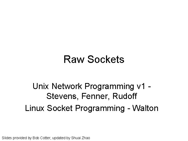 Raw Sockets Unix Network Programming v 1 Stevens, Fenner, Rudoff Linux Socket Programming - Walton Slides provided by Bob Cotter, updated by Shuai Zhao