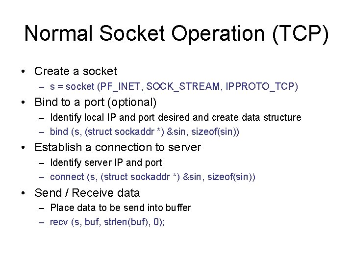 Normal Socket Operation (TCP) • Create a socket – s = socket (PF_INET, SOCK_STREAM, IPPROTO_TCP) • Bind to a port (optional) – Identify local IP and port desired and create data structure – bind (s, (struct sockaddr *) &sin, sizeof(sin)) • Establish a connection to server – Identify server IP and port – connect (s, (struct sockaddr *) &sin, sizeof(sin)) • Send / Receive data – Place data to be send into buffer – recv (s, buf, strlen(buf), 0);