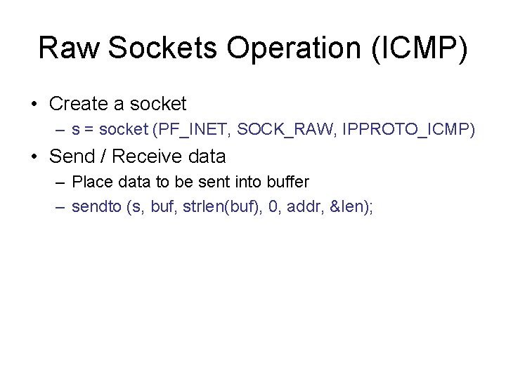 Raw Sockets Operation (ICMP) • Create a socket – s = socket (PF_INET, SOCK_RAW, IPPROTO_ICMP) • Send / Receive data – Place data to be sent into buffer – sendto (s, buf, strlen(buf), 0, addr, &len);