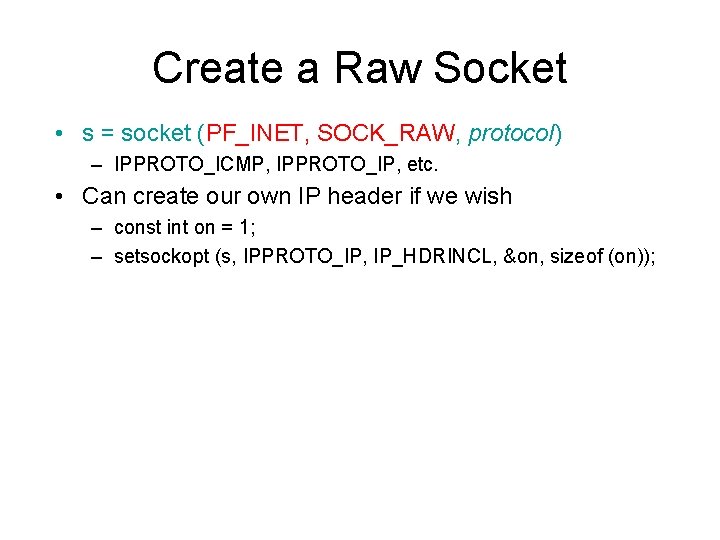 Create a Raw Socket • s = socket (PF_INET, SOCK_RAW, protocol) – IPPROTO_ICMP, IPPROTO_IP, etc. • Can create our own IP header if we wish – const int on = 1; – setsockopt (s, IPPROTO_IP, IP_HDRINCL, &on, sizeof (on));