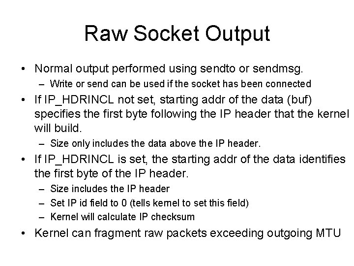Raw Socket Output • Normal output performed using sendto or sendmsg. – Write or send can be used if the socket has been connected • If IP_HDRINCL not set, starting addr of the data (buf) specifies the first byte following the IP header that the kernel will build. – Size only includes the data above the IP header. • If IP_HDRINCL is set, the starting addr of the data identifies the first byte of the IP header. – Size includes the IP header – Set IP id field to 0 (tells kernel to set this field) – Kernel will calculate IP checksum • Kernel can fragment raw packets exceeding outgoing MTU