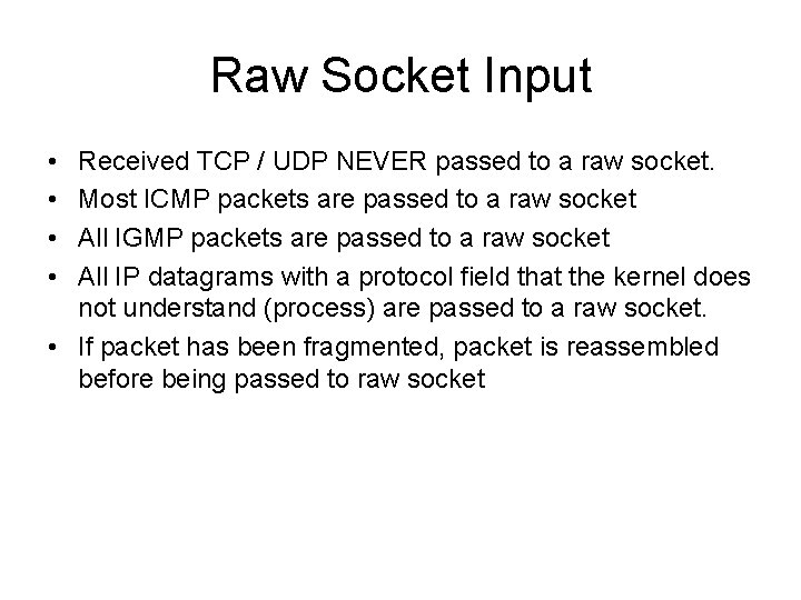 Raw Socket Input • • Received TCP / UDP NEVER passed to a raw socket. Most ICMP packets are passed to a raw socket All IGMP packets are passed to a raw socket All IP datagrams with a protocol field that the kernel does not understand (process) are passed to a raw socket. • If packet has been fragmented, packet is reassembled before being passed to raw socket