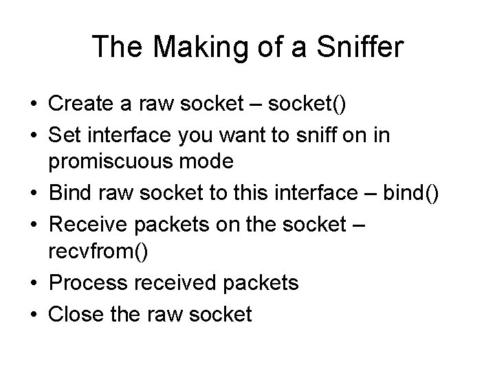The Making of a Sniffer • Create a raw socket – socket() • Set interface you want to sniff on in promiscuous mode • Bind raw socket to this interface – bind() • Receive packets on the socket – recvfrom() • Process received packets • Close the raw socket