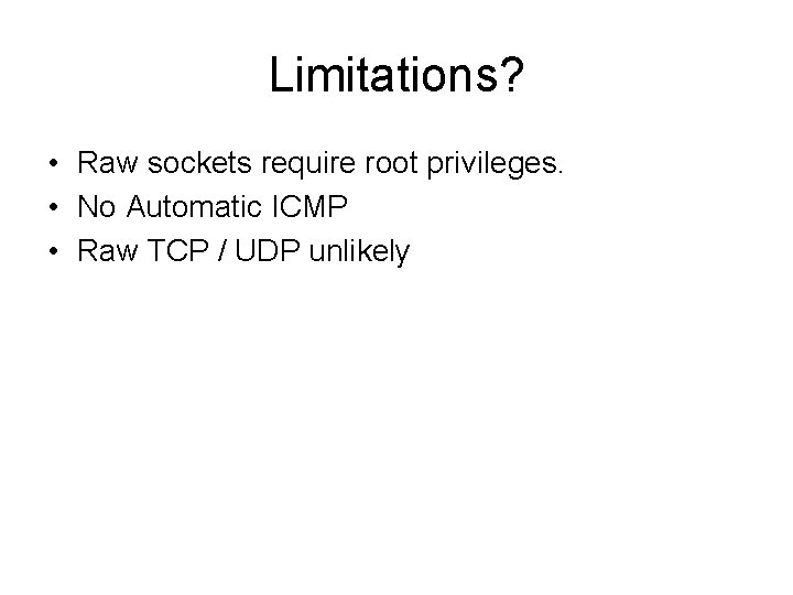 Limitations? • Raw sockets require root privileges. • No Automatic ICMP • Raw TCP / UDP unlikely